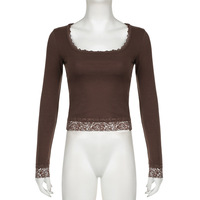 T-shirt sexy personnalisé pour femmes, coupe ajustée, couleur unie, col en U, manches longues, haut à empiècements en dentelle pour le printemps et l'automne